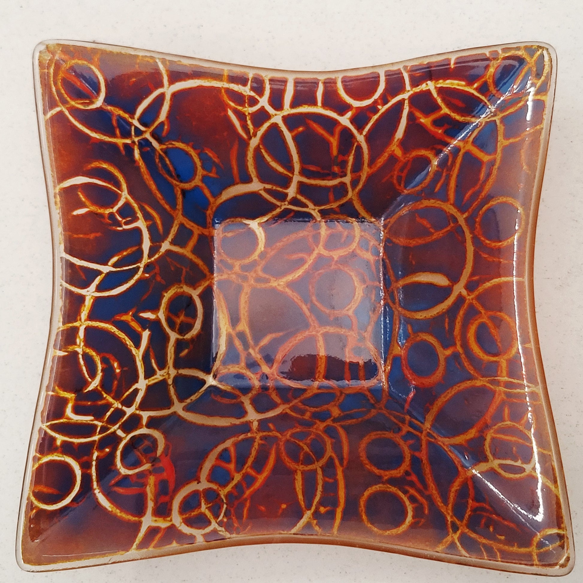 This large bowl features vibrant reds, blues with mesmerizing circles cut throughout. At 12x12x4 this bowl is a handsome display piece and makes a fabulous salad bowl.