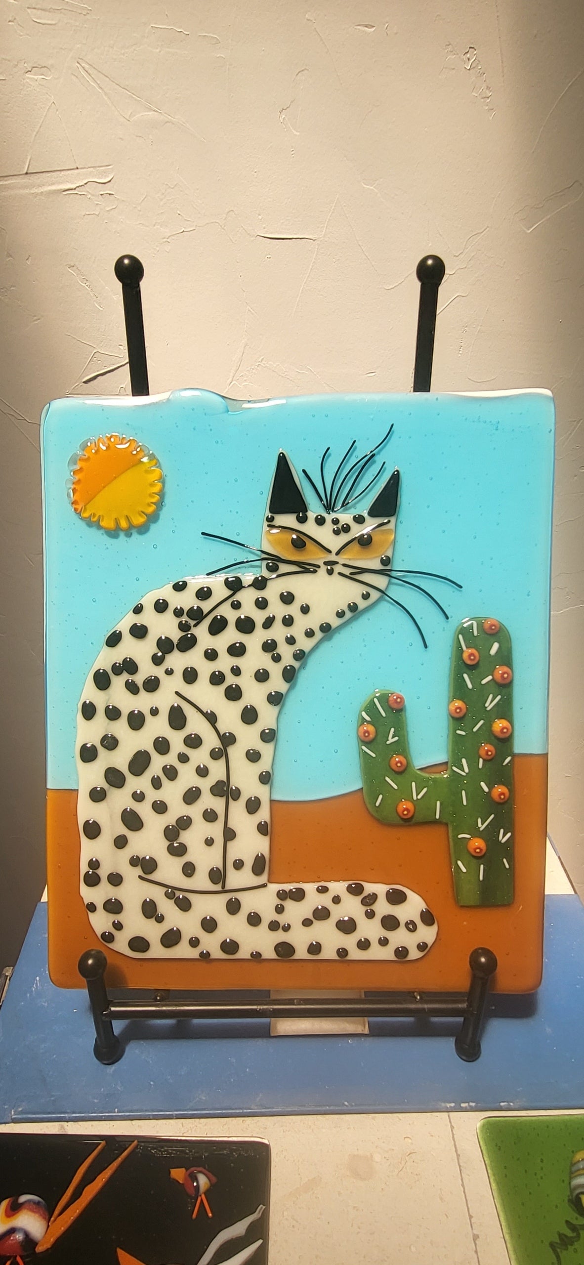 Set in the dusty desert with a turquoise sky and hot-hot sun, the top-tufted desert leopard is a delightful flat panel ready for framing or can be adapted for direct wall mount.