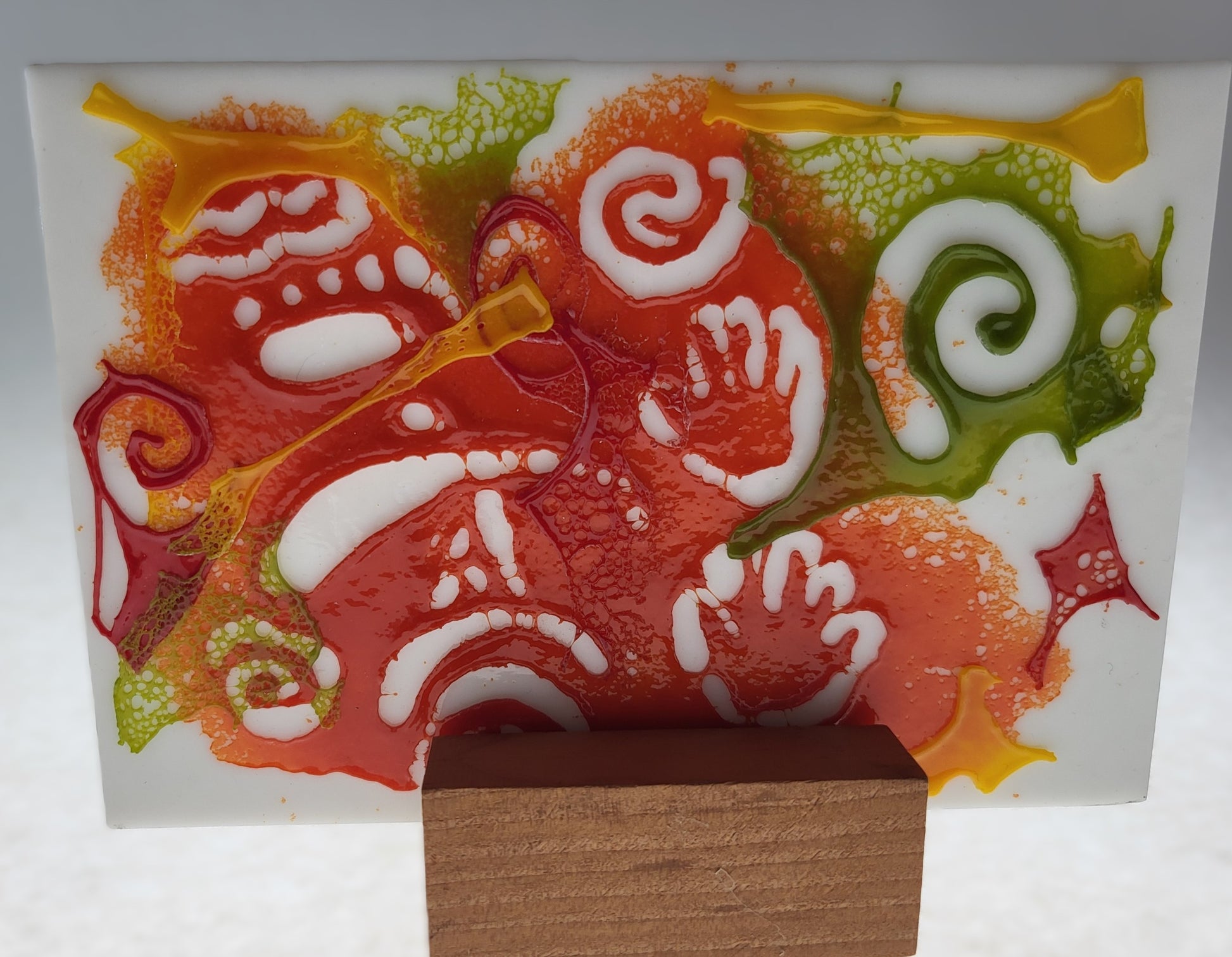 This colorful work incorporates many of the iconic features from SW cave paintings - hands, spirals and other shapes.